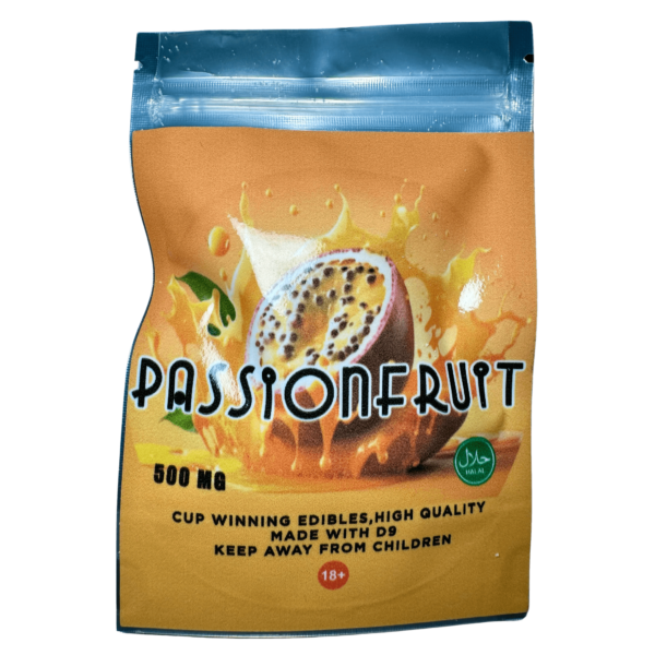 Passion Fruit Edibles, are chewy sugar coated drops with passion fruit flavour. They contain 500mg per pack.
