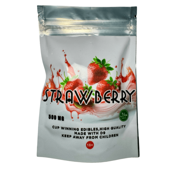 Strawberry Edibles, are chewy sugar coated drops with strawberry flavour. They contain 500mg per pack.